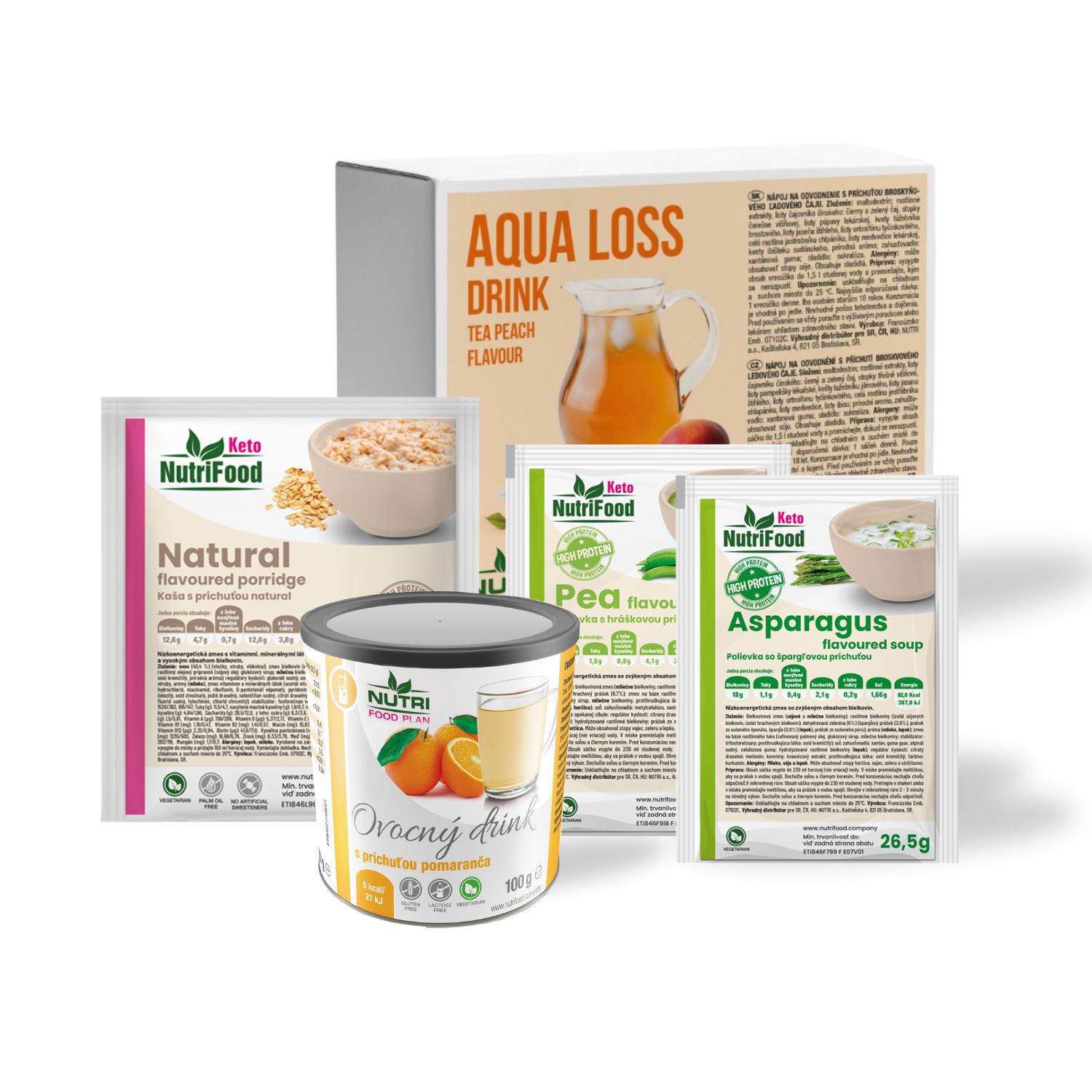 Balení doplňuje nízkokalorický pomerančový nápoj, který podporuje pitný režim během dne a zároveň osvěžuje bez zbytečného cukru. Výživovou část balíčku tvoří dvě proteinové polévky – chřestová a hrachová – které nezatěžují trávení, ale dodávají tělu důležité bílkoviny. Jemná Natural kaše je vhodná ke snídani nebo lehké večeři.