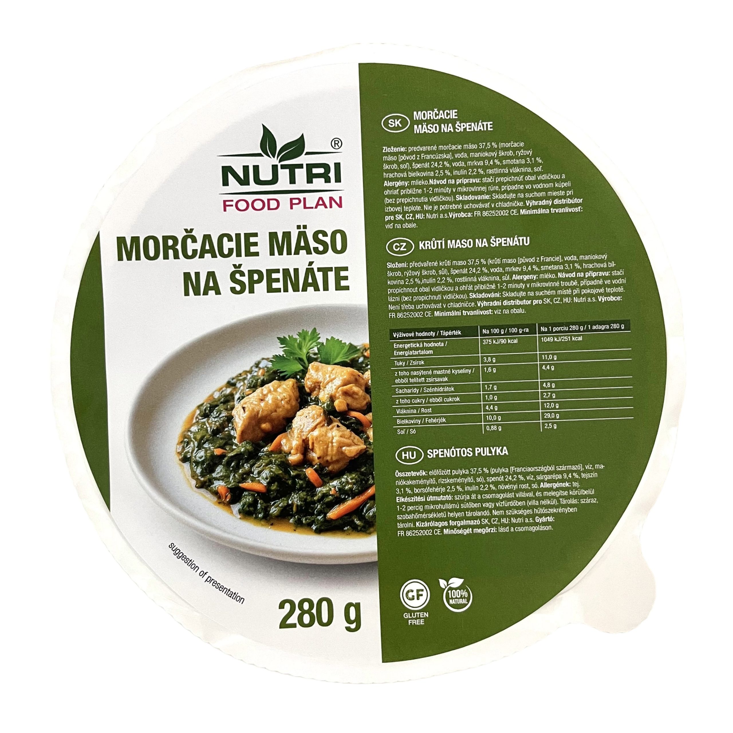Toto nízkosacharidové jídlo se připravuje z kvalitního krůtího masa a dušeného špenátu se smetanovým základem, který mu dodává krémovou chuť a výbornou texturu.