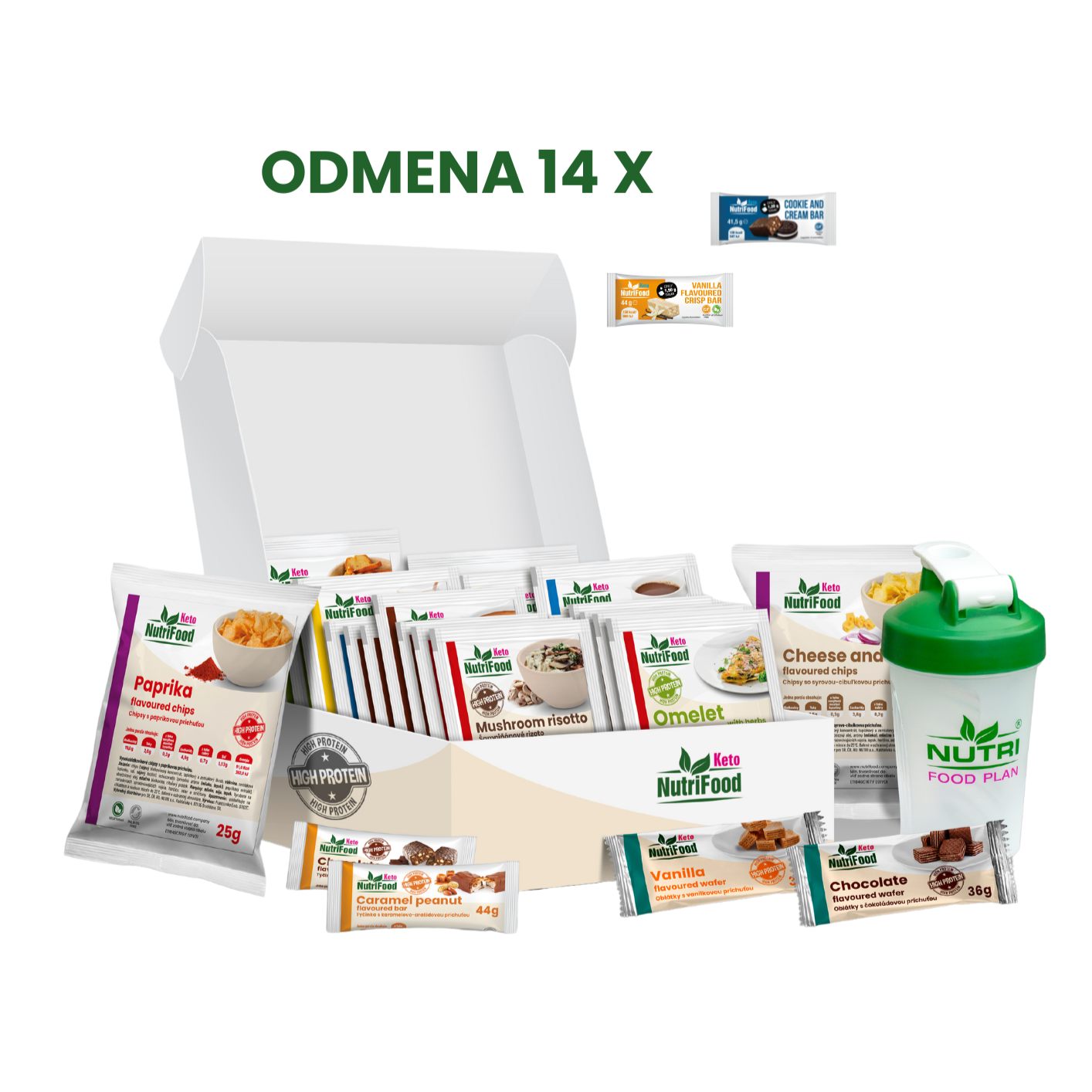 Jídelníček na 2 týdny vhodný pro osoby do 80 kilogramů se skládá ze 44+14 porcí vysokoproteinových potravin NutriFood Keto.